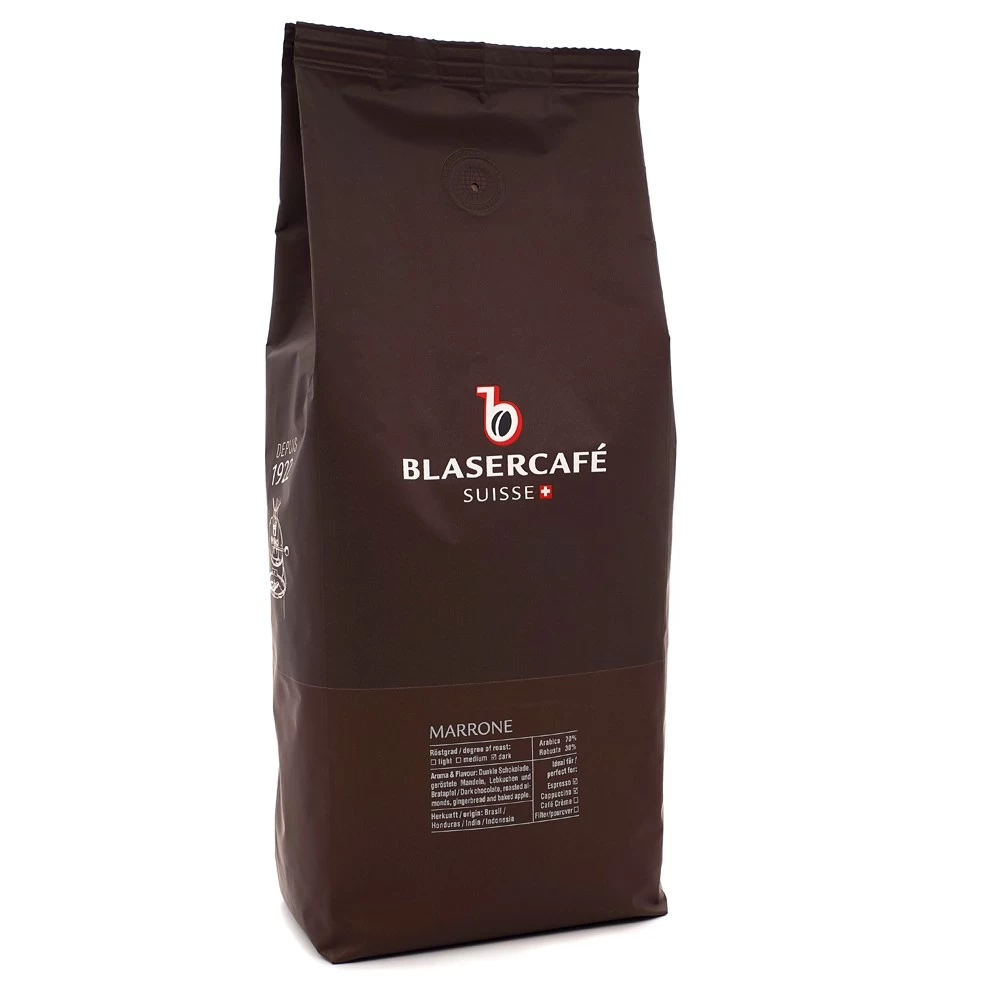 Die Röstung Marrone ist das neue Flaggschiff der Espressoröstungen von Blasercafé. Die Rohkaffees aus Brasilien, Indien, Indonesien und Honduras ergänzen sich in ihren Geschmacksprofilen ganz wunderbar und zeigen sich mild-würzig mit viel Süsse, wenig Säure und langem Abgang. Vollmundig und mit dichter Crema erobert Marrone die Gaumen auch anspruchsvoller Genießer.