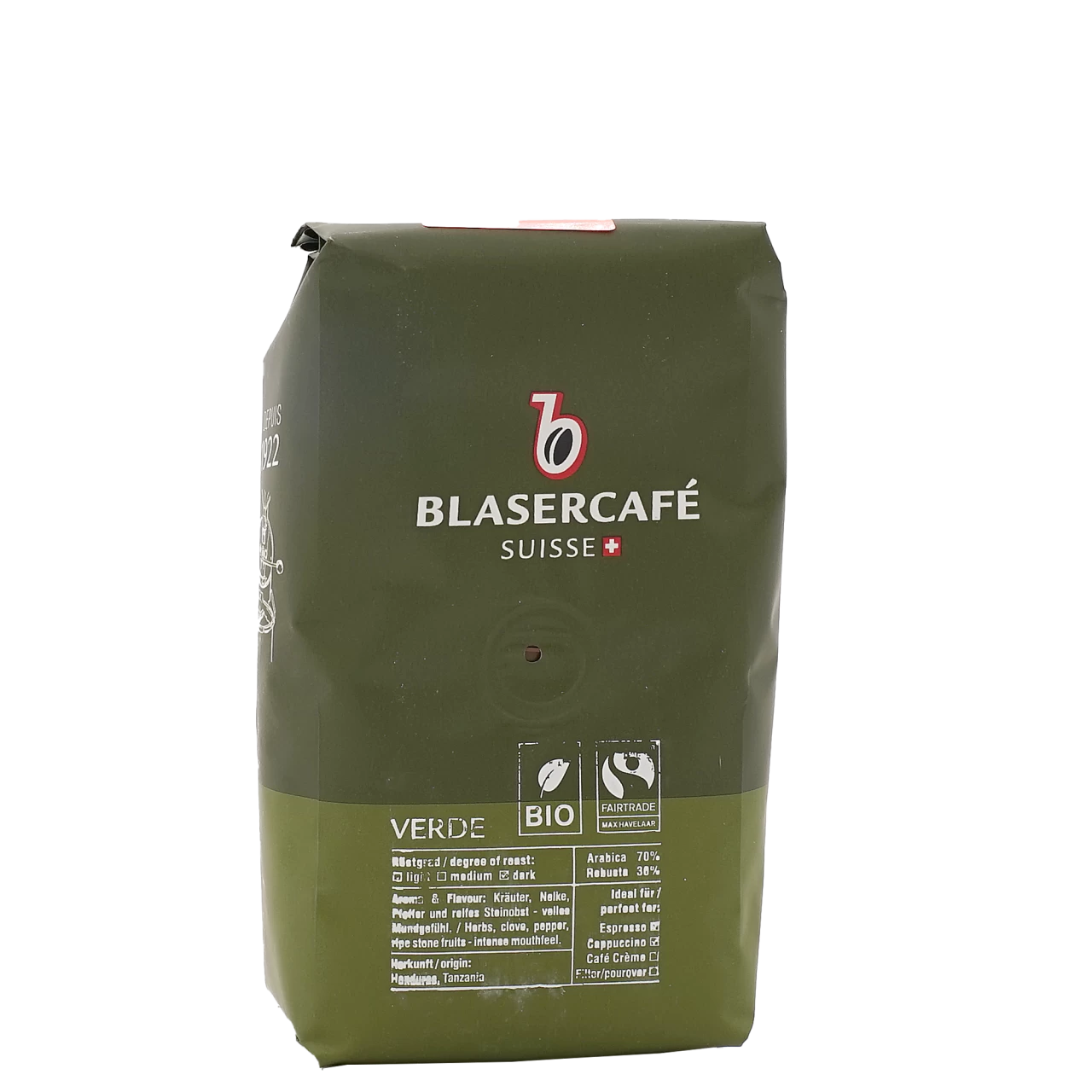 Geschickt gemischt und recht dunkel geröstet zeigt sich Blasercafé Bio Verde in der Tasse – getragen von einem leichten, kaum spürbaren Säuregerüst – mit gut ausbalanciertem Gesamteindruck bei guter Fülle. Im Aromenspektrum findet sich neben Kräutern und Pfeffer auch fruchtige Noten von reifem Steinobst .