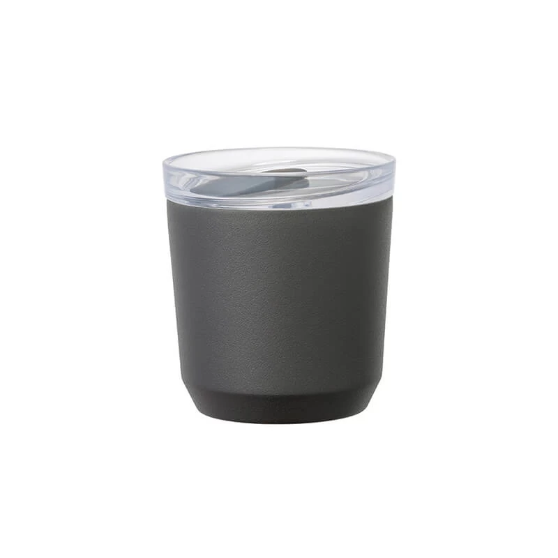Dank der doppelwandigen Bauweise aus Edelstahl und dem Vakuum wirkt der Kaffeebecher von Kinto für unterwegs isolierend. Der Thermoeffekt hält Heißgetränke länger warm und Kaltgetränke länger kühl. Die konische Form des Kaffeebechers sieht nicht nur gut aus, sie erweist sich im Alltag in zweierlei Hinsicht als besonders praktisch. Einerseits passt der Becher mit dem schmaler werdenden unteren Ende bequem in die meisten Getränkehalterungen. Andererseits lassen sich mehrere dieser To-Go-Becher stabil stapeln und so platzsparend aufbewahren. Die außen aufgetragene Pulverbeschichtung in Schwarz verleiht dem Becher eine besonders edle Optik. Die matt-raue Textur liegt darüber hinaus besonders angenehm in der Hand. Die Größe von 240 ml ist perfekt geeignet für mittlere Portionen – egal ob Filterkaffee, Cold Brew oder ein Milchmischgetränk wie zum Beispiel einen köstlichen Cappuccino. Mit einer Höhe von 82 mm ohne Deckel passt der Kinto Becher unter direkt unter den Auslauf der meisten Kaffeemaschinen.