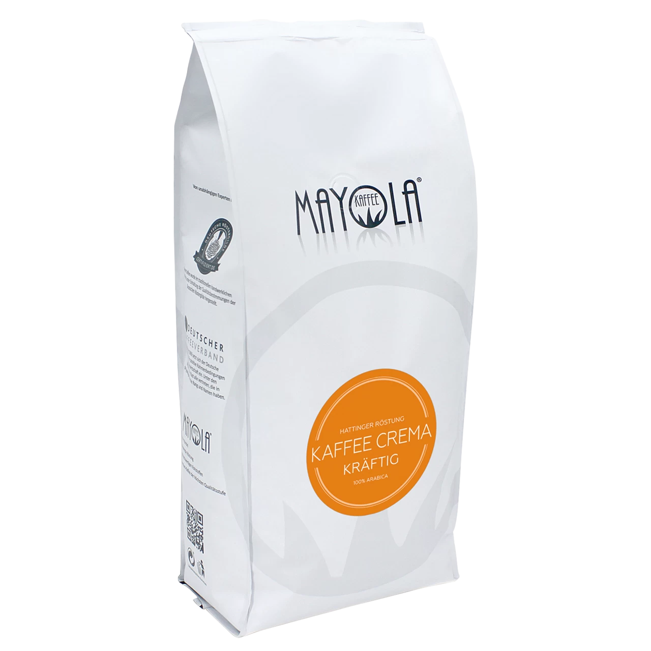 Das Schöne bei Mayola ist der fokussierte Aufbau des Sortiments. Die ‚Beschränkung‘ auf nur wenige Blends und Röstungen erlaubt es Röstmeister Olaf Scherff, sich voll auf das Wesentliche zu konzentrieren: die Auswahl der Rohkaffees und die Röstung genau auf den Punkt. Für jeden Rohkaffee übrigens einzeln, so kitzelt er die Aromen besser heraus. Beim etwas dunkler gerösteten Mayola Kaffee Crema kräftig sind die Fruchtnoten zwar vorhanden, aber zurückhaltender als bei der milden Röstung. Dafür tauchen im langen Abgang mehr Schokoladennoten auf. Aber auch hier gilt: perfekt wird die Tasse nur mit genügend Flüssigkeit, also besser nicht als Espresso verwenden, die Fruchtnoten benehmen sich dann etwas unausgeglichen. Bei richtiger Zubereitung erfreuen uns die fair gehandelten Arabicas mit ihren blumigen Noten, dem zarten Schmelz in der Tasse und der universellen Verwendbarkeit in Vollautomaten, Siebträgermaschinen und Filter- / French-Press-Systemen. Die Bohnen des Kaffee Crema kräftig kommen aus Brasilien, Guatemala, Ethiopia und Costa Rica.