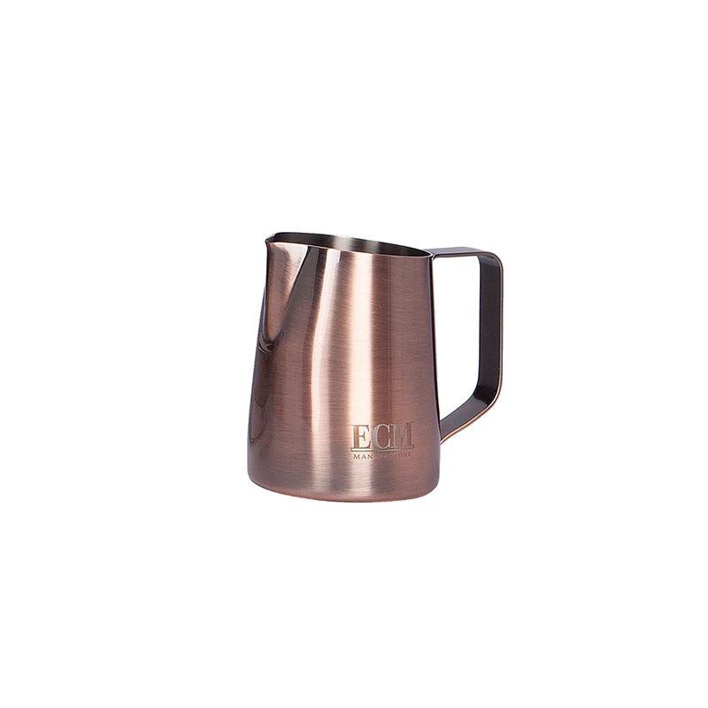 Das ECM Milchkännchen Heritage Line macht die ECM Designkollektion Heritage Line komplett. Die Kupferoptik passt hervorragend zu den entsprechenden Maschinen, welche mit Kupferakzenten daherkommen. Das Milchkännchen von ECM eignet sich hervorragend zum Schäumen und Gießen von Latte Art Motiven. Entscheiden hierfür ist einerseits die Ausgusstülle, welche mit einer Geometrie zwischen spitz und rund liegt und somit sowohl für feine, als auch gröbere Motive geeignet ist. Andererseits hat ECM dem Milchkännchen eine leichte Abschrägung am oberen Rand verpasst, welche dafür sorgt, dass die Spitze besonders nah an die Oberfläche des Getränks geführt werden kann. Je näher zur Oberfläche man gießt, desto klarer wird der weiße Milchschaum sichtbar. Auch der Henkel liegt besonders gut in der Hand, was bei filigranen Bewegungen ein entscheidender Vorteil ist. Die Größe von 450 ml eignet sich perfekt für mittelgroße Milchgetränke. Für Latte Art sollte das Milchkännchen beim Gießen nicht zu voll sein, um möglichst waagerecht nah an die Oberfläche zu kommen.