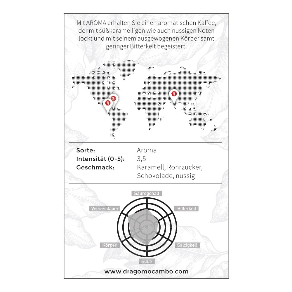 Mit viel Geduld, langjähriger Erfahrung und einem ausgezeichneten Fingerspitzengefühl für den richtigen Röstgrad entstehen bei Drago Mocambo außergewöhnliche Kaffee-Spezialitäten. Auf die mittlerweile vierte Sorte ist die Familie besonders stolz: Mocambo AROMA .