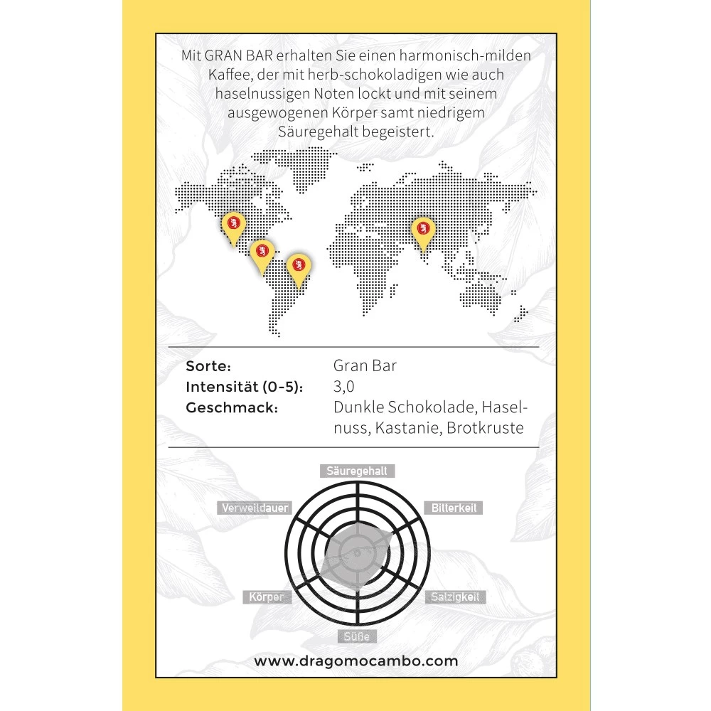 Mocambo Gran Bar besteht aus insgesamt sechs verschiedenen Rohkaffees aus , und . Sie bilden die Grundlage für diesen außergewöhnlich milden Kaffee. Etwa 18 Minuten bei 220 °C im klassischen dauert es, dann ist der Gran Bar fertig. Erst nach dem Ausgasen geht es ab in die goldene Tüte, die seit jeher das Kennzeichen für die beste Qualität von Mocambo ist.