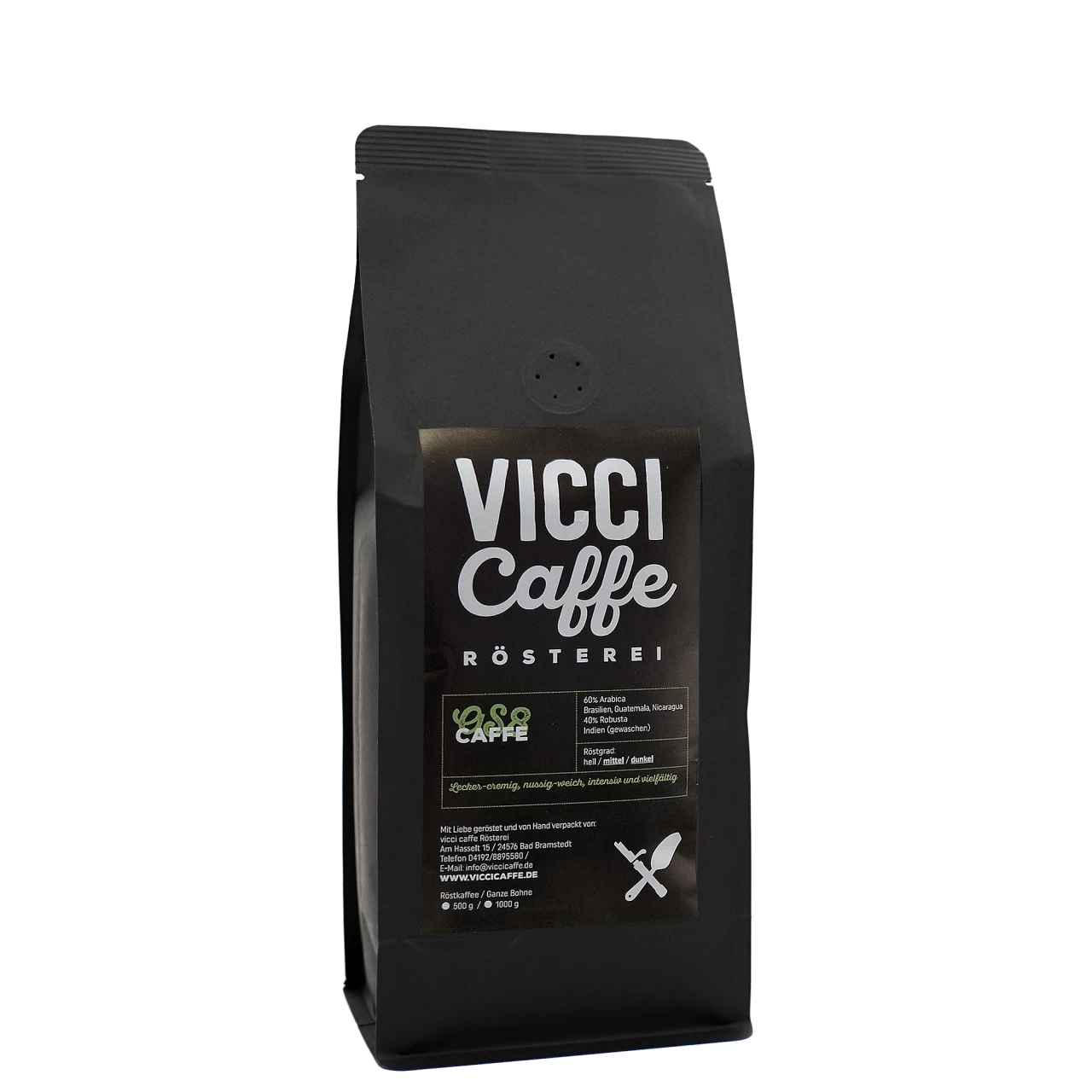 Röstmeister Stefan Müller von der norddeutschen Rösterei Vicci Caffè präsentiert uns ’seinen‘ Caffe Creme. Das gekonnte Zusammenspiel der einzelnen Rohkaffees verleiht dem Blend ein komplexes Aroma und ein ausgesprochen samtiges Mundgefühl. Für die Weichheit sind vor allem die Bohnen aus Brasilien verantwortlich. Guatemala steht für Karamell, Schokolade und ein angenehm cremig würziges Geschmackserlebnis. Die natürliche Süße der nicaraguanischen Bohnen setzt ein weiteres Ausrufezeichen. Den letzten Schliff erhält Vicci Caffe Creme durch die gewaschenen Robustas aus Indien. Die sind weich, vollmundig mit vielschichtigen Aromen und zeichnen sich vor allem durch ihre Fülle aus.