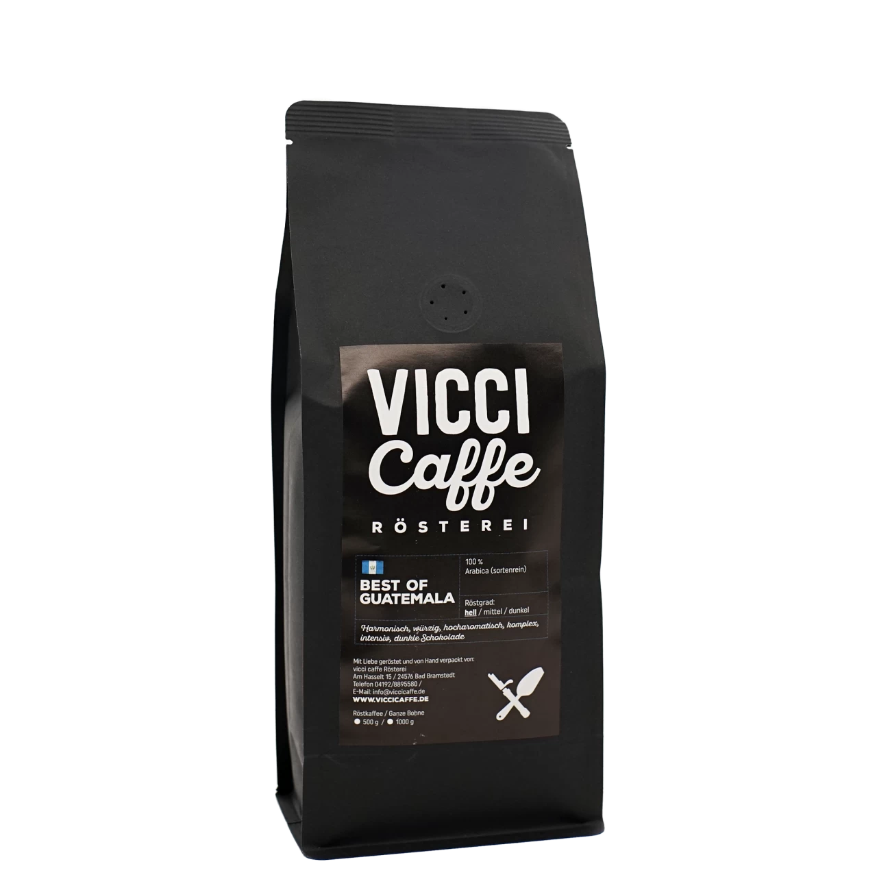 Die hochwertigen Antiguabohnen werden von weiter veredelt. Jede(!) Charge wird von ihm persönlich kontrolliert und individuell geröstet. Das Ergebnis kann sich im wahrsten Sinne des Wortes sehen lassen. Für uns ist Vicci Caffe Guatemala Antigua ein klarer Medaillenfavorit bei der Wahl des schönsten Bohnenbildes.