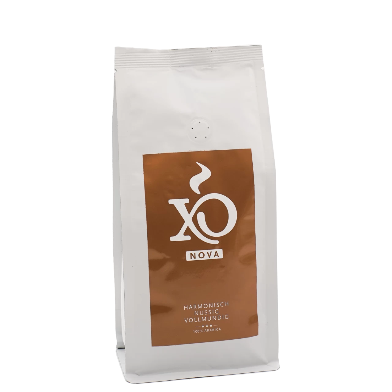 XO Nova (Nova = lat. neu, unentdeckt, modern) zeigt sich komplex, säurearm und äußerst vollmundig. Die Mischung ist einfach und kein Geheimnis: 60 % Arabica aus Brasilien und 40 % Arabica aus Kolumbien. Das Geheimnis des guten Geschmacks liegt an anderer Stelle verborgen, und das soll auch so bleiben 😉