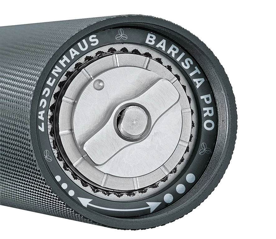 Die BARISTA PRO Handmühle von Zassenhaus vereint genau die Features, die eine gute Mühle ausmachen. Sie besteht aus Aluminium und Edelstahl und eignet sich für einen sehr feinen bis groben Mahlgrad. Die Mühle kommt mit zwölf Mahlgrad-Einstellungen daher, sodass für jede Kaffeespezialität die passende Zubereitung möglich ist. Diese sind an der Unterseite der Mühle in feinen Stufen einstellbar. Für ein präzises Mahl-Ergebnis sorgen scharfe Zähne und Schneidekanten des Hochleistungsmahlwerks aus CNC-gefrästem Edelstahl.